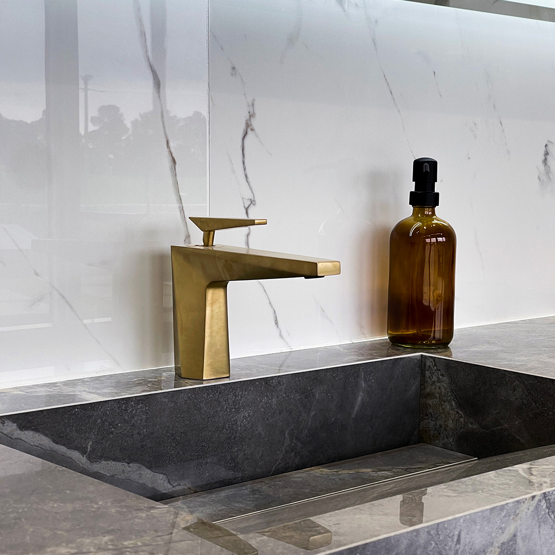 🪨 Vasque suspendue en grès cérame effet pierre avec robinetterie dorée brossée